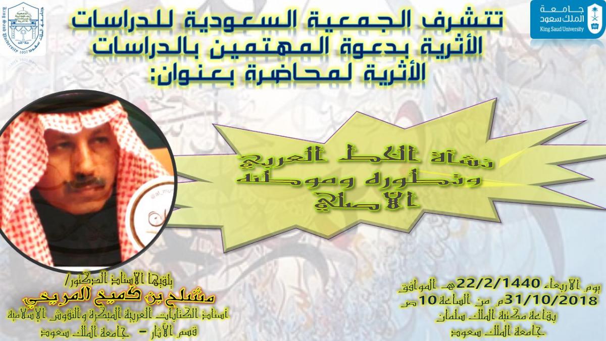 إلقاء سعادة الأستاذ الدكتور/ مشلح المريخي عضو الجمعية محاضرة بعنوان " نشأة الحرف العربي وتطوره وموطنه الأصلي" وذلك فى قاعة مكتبة الملك سلمان بجامعة الملك سعود، يوم الأربعاء 22/2/1440هـ الموافق 31/10/2018م